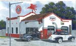 This painting will be published on my 2007 Texas Classic Gas Stations Calendar. This Station is at 621 St. George Street in Gonzales, texas and it opened in 1936 and closed in the early 1970's After housing several different businesses it was purchased by current owner Bobby Bowden who restored it in 2000 to its former glory. No gas but a standing reminder of the way things used to be!!
